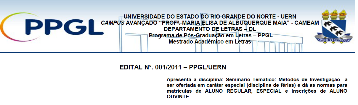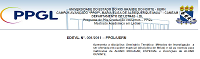 Mesmo estando a UERN em tempos de greve venho através deste solicitar ampla divulgação da disciplina de Férias "Métodos de Investigação", ministrada pelo Prof. Dr. Fernando Bessa de Portugal, nos dias 08 e 09/08 (15h/01 crédito), conforme Edital, em anexo, para a qual serão aceitos alunos especiais advinda de outras IES. A disciplina ocorrerá por ocasião do II Colóquio do Imaginário em Natal, com o qual o PPGL estabeleceu parceria.